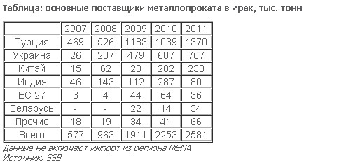 В 2011 году из Украины в Ирак было поставлено 767 тыс. тонн металлопроката. В географической структуре отечественного экспорта это государство заняло 9 место, совсем немного уступив Индии и Индонезии. Согласно данным информационного агентства Steel Business Briefing (SBB, Великобритания) для самого Ирака поставки из Украины имели гораздо большее значение: наша страна по итогам прошлого года оказалась на втором месте среди поставщиков стали на иракский рынок. Мы уступили лишь Турции, которая экспортировала почти в 2 раза больше – 1,37 млн тонн проката, и существенно опередили Китай (230 тыс. тонн).