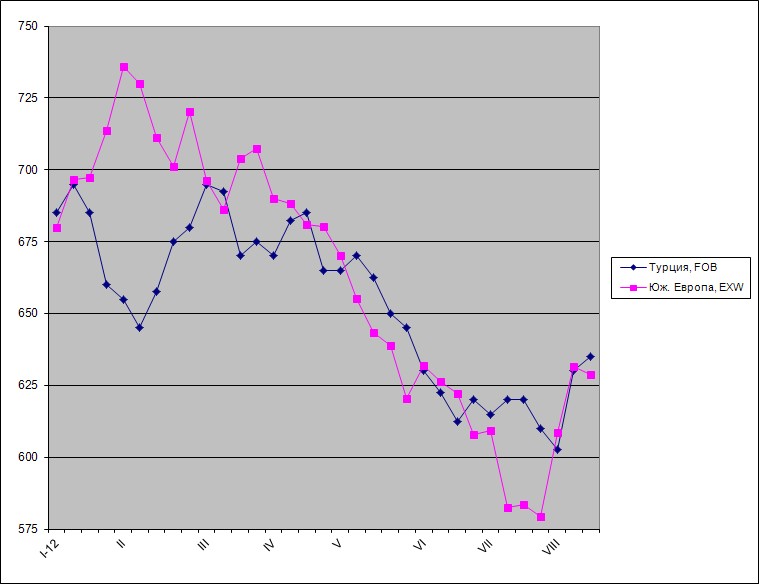 В отличие от начала июля, турецкие компании могут не опасаться конкуренции со стороны европейских производителей. Многие мини-заводы устроили себе в этом году более длительные каникулы, чем обычно, и за счет ограничения объема предложения смогли сбалансировать внутренний рынок длинномерного проката и даже добиться заметного повышения цен. В августе арматура в Южной Европе стабилизировалась на уровне 510-520 евро за т EXW, что даже выше, чем в Германии и Центральной Европе, где конкуренция более жесткая. При экспорте испанская и итальянская арматура также не опускается ниже $630-635 за т FOB. Правда, в случае обострения обстановки в европейском финансовом секторе курс евро, относительно стабильный на протяжении последних нескольких недель, может снова пойти вниз.