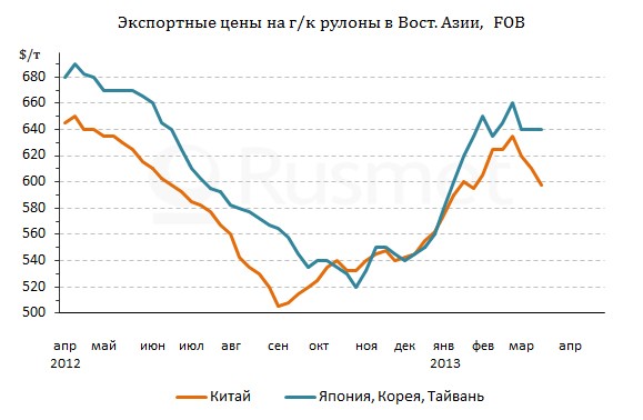 Тем не менее, японским производителям горячего проката, в феврале пытавшимся довести стоимость своей продукции в Азии до $670-680 за т FOB, пришлось сбавить котировки на апрель-май до $640-650 за т FOB. Впрочем, их конкуренты поступили точно так же: стоимость корейских и японских горячекатаных рулонов в середине марта не превышала $630-640 за т FOB.