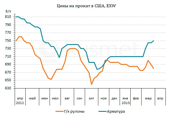 В конце марта – начале апреля стоимость арматуры в США достигла $750 за метрическую т EXW, а низкоуглеродистой катанки – около $750-765 за т EXW, но в ближайшее время ожидается новое понижение. Металлолом в США в апреле пошел вниз, причем, если ранее его удешевление оценивалось примерно в $10 за т, то теперь более вероятным выглядит спад на $20 за т. Очевидно, вместе с ломом уменьшится в цене длинномерный прокат. Тем более, что в текущем месяце на американский рынок должны поступить значительные объемы дешевого импорта. Турецкие компании продают арматуру в США по $615-625 за т CFR, а китайская катанка котируется на уровне $625-635 за т CFR.