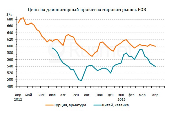 В начале апреля цены на турецкую арматуру снова немного понизились. Сделки с крупными покупателями в ОАЭ и США заключались, в основном, на уровне $595 за т FOB, и только при продаже относительно небольших партий в страны Африки и Латинской Америки были достижимы цены порядка $605 за т FOB. На внутреннем рынке Турции, где также не наблюдается особого оживления в строительной отрасли, котировки опустились в интервал от немногим менее $600 до $610-615 за т EXW (без НДС).