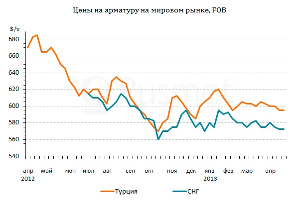 В течение всей второй половины апреля турецкая арматура котировалась на внешнем рынке на уровне $590-600 за т FOB. Большая часть поставок, при этом, приходилась на Саудовскую Аравию, ОАЭ, США и африканские страны. Ближе к концу месяца немного активизировались иракские покупатели, но они, как правило, приобретают мелкие партии продукции примерно по $605-610 за т EXW. Украинские производители в настоящее время предлагают арматуру по $570-585 за т FOB, но реальные сделки, по данным трейдеров, заключаются из расчета не более $575 за т FOB.