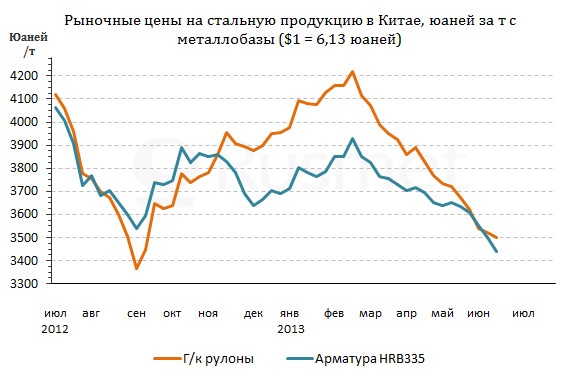 Причина этого спада давно всем известна. Это избыток предложения стальной продукции при недостаточном спросе. Темпы роста китайской экономики замедляются. Кризис в западных странах привел к уменьшению потребностей в китайских товарах: в мае объем экспорта опустился до самой низкой отметки за последние десять месяцев. Правительство, лишь в марте этого года приступившее к исполнению своих обязанностей, не торопится предпринимать радикальные меры по стимулированию внутреннего потребления. Наконец, на юге страны начался сезон дождей, приведший к снижению активности в строительной отрасли.