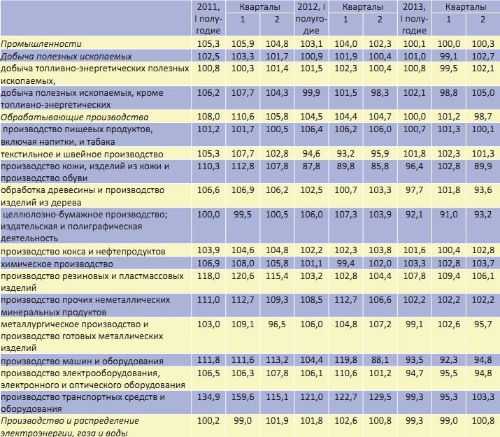 Впервые СЃ 2009 Рі. РІ первой половине 2013 Рі. промпроизводство осталось РЅР° СѓСЂРѕРІРЅРµ РђРџРџР“. Р’ I квартале 2013 Рі. стабилизация выпуска РїСЂРѕРјС‹С?ленности была обеспечена слабым ростом обрабатывающего производства РЅР° 1,2% относительно РђРџРџР“. Р’Рѕ II квартале текущего РіРѕРґР° РїСЂРѕРёР·РѕС?ла смена лидеров – СЂРѕСЃС‚ добычи полезных ископаемых РЅР° 2,7% купировал спад выпуска обрабатывающего производства РЅР° 1,3%. Р’ обрабатывающем производстве РЅР° динамику развития существенное влияние оказывают структурные факторы. Р’ январе-РёСЋРЅРµ 2013 Рі. СЂРѕСЃС‚ производства сохранялся РІ РЅРёР·РєРѕ- Рё среднетехнологических видах экономической деятельности. Р’ производстве потребительских товаров отмечен СЂРѕСЃС‚ выпуска пищевых продуктов, Р° также текстильного Рё С?вейного производства. Р’ сегменте товаров промежуточного СЃРїСЂРѕСЃР° сохраняют лидерство химическое производство, производство резиновых изделий, производство нефтепродуктов.